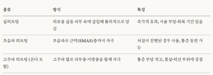 리프팅이라고 다 같은 시술이 아니에요. 방식에 따라 접근도, 적합한 대상도 달라요.
